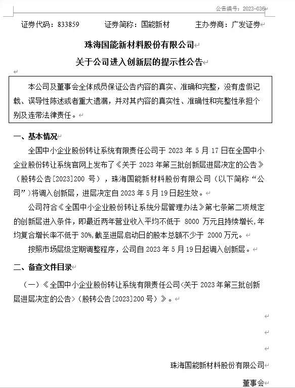 全國中小企業(yè)股份轉(zhuǎn)讓系統(tǒng)有限責(zé)任公司于 2023 年5月17 日在全國中小企業(yè)股份轉(zhuǎn)讓系統(tǒng)官網(wǎng)上發(fā)布了《關(guān)于 2023 年第三批創(chuàng)新層進(jìn)層決定的公告》(股轉(zhuǎn)公告[2023]200 號),珠海國能新材料股份有限公司將調(diào)入創(chuàng)新層,進(jìn)層決定自 2...